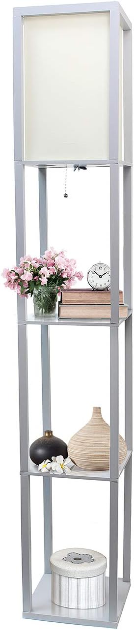 This combination lamp and storage unit solves two problems simultaneously. Three wooden shelves provide display space for books, plants, or decor while the fabric shade delivers ambient lighting. At 63 inches tall, it functions as a proper floor lamp while the shelves keep your stuff organized.